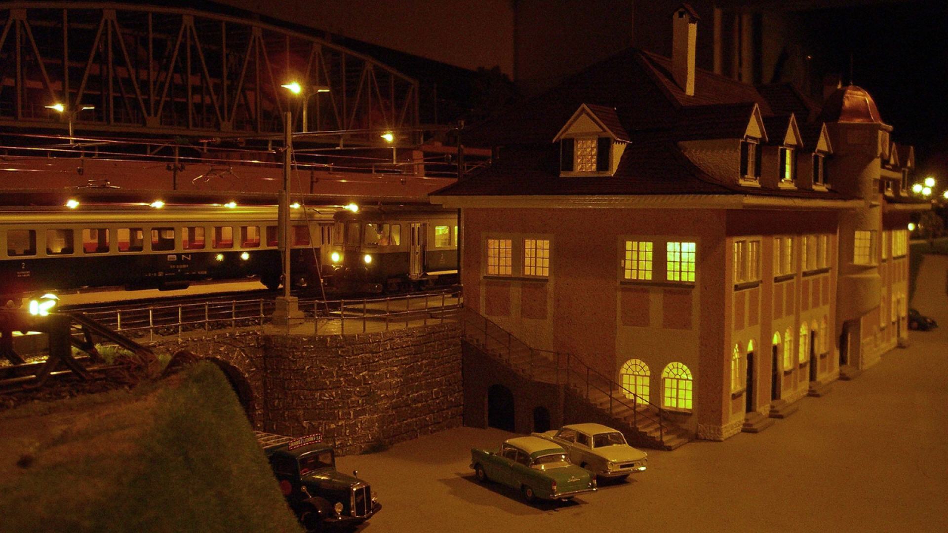 Kandersteg aus den 60er Jahren ist wieder auferstanden. Die Anlage läuft mit echtem Oberleitungsbetrieb. Das ganze Areal, d.h. Gleise, Unterbau (Holz), Weichen, Oberleitungsmasten, stammen aus der "Morgensonne".